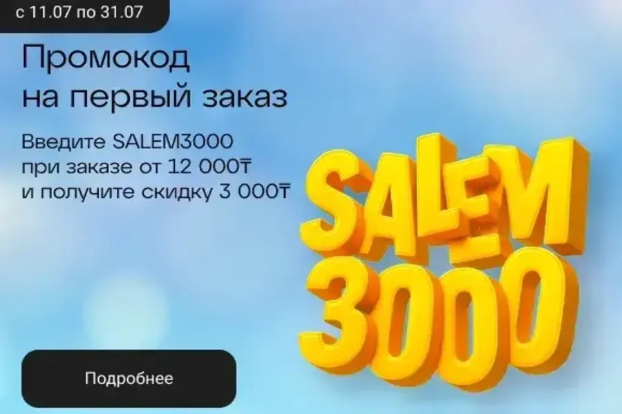 Хотите сделать выгодные покупки? Теперь это легко! Введите промокод SALEM3000 при заказе от 12 000 ₸ и получите скидку 3 000 ₸ на первый заказ в нашем интернет-магазине.
